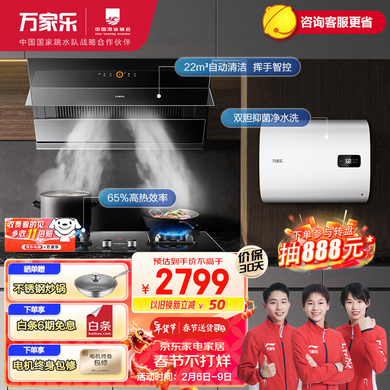 万家乐烟灶热水器套装 22立方挥手烟灶60L扁桶WIFI智控电热水器多件套装AL061+KV061B+60FB0天然气价格:2999.00元!