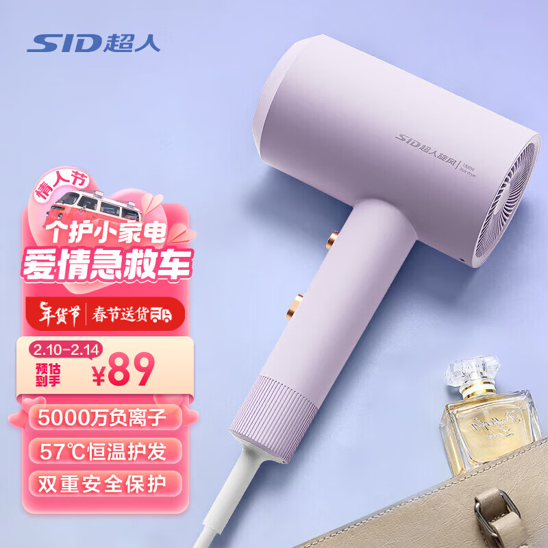 超人(SID)家用电吹风机 5000万负离子护发吹风筒 1800W大风量速干便携简约电吹风DJ818紫价格:109.00元!