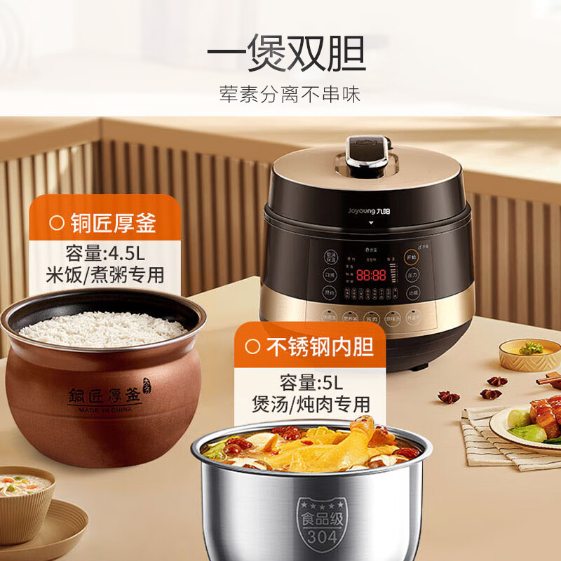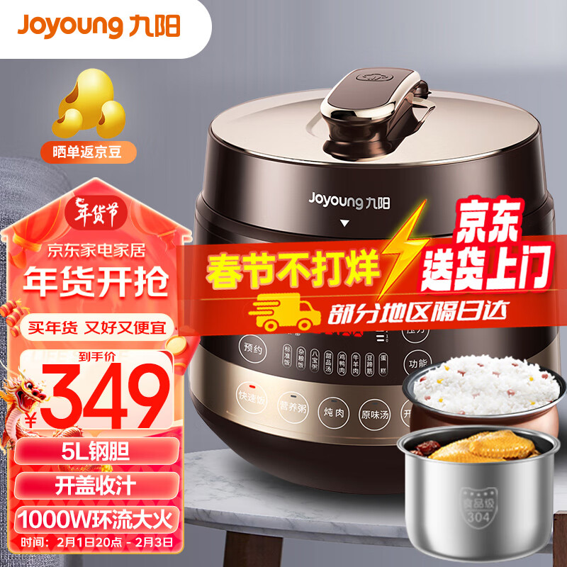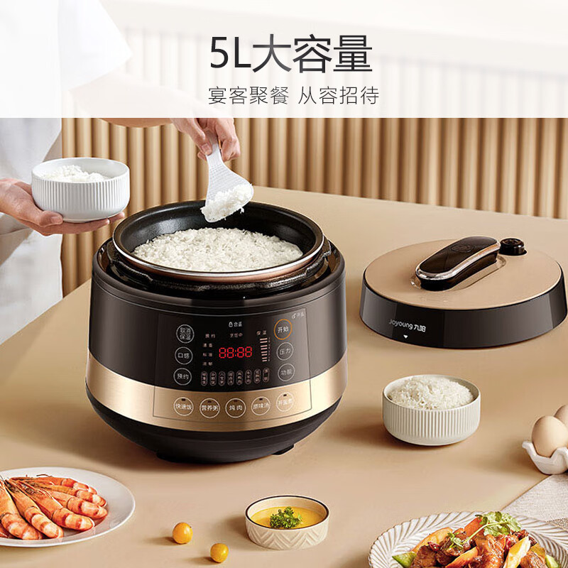 九阳(Joyoung)智能家用5升电锅煲1000W大火力304不锈钢釜内胆半息多功能大屏预约定时5L电高压锅50C90-B价格:379.00元!