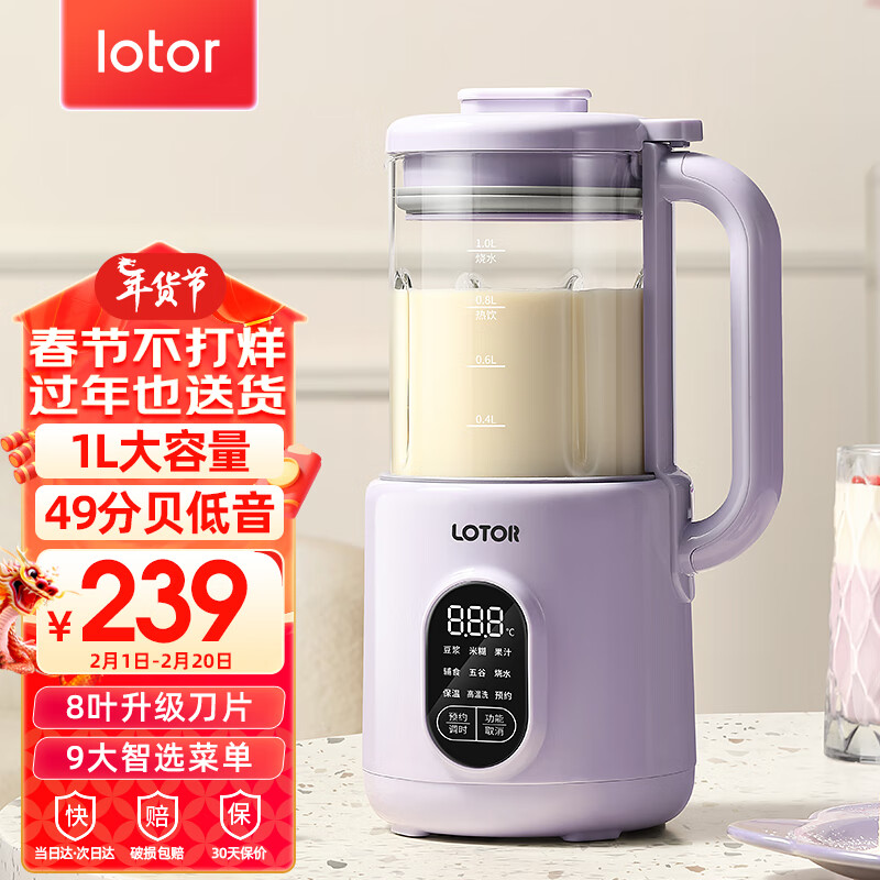 小浣熊豆浆机迷你破壁机五谷杂粮1-2人家用小型全自动静音免滤免洗米糊机榨汁机料理机婴儿辅食机3人4 1L紫色玻璃款价格:309.00元!