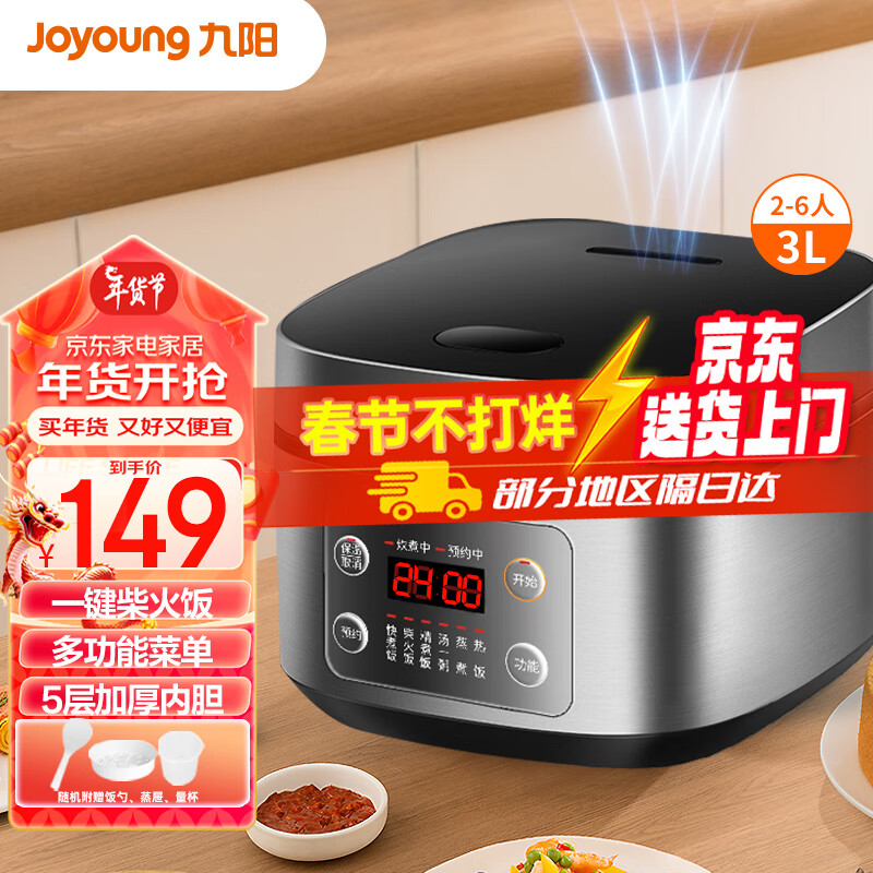 九阳(Joyoung)3L家用2-6人智能多功能电饭煲电饭锅不粘内胆大火力柴火饭五段加热3升年货送长辈送老人30FZ630价格:149.00元!