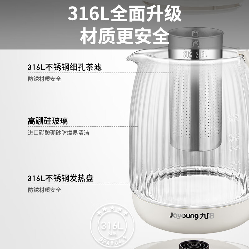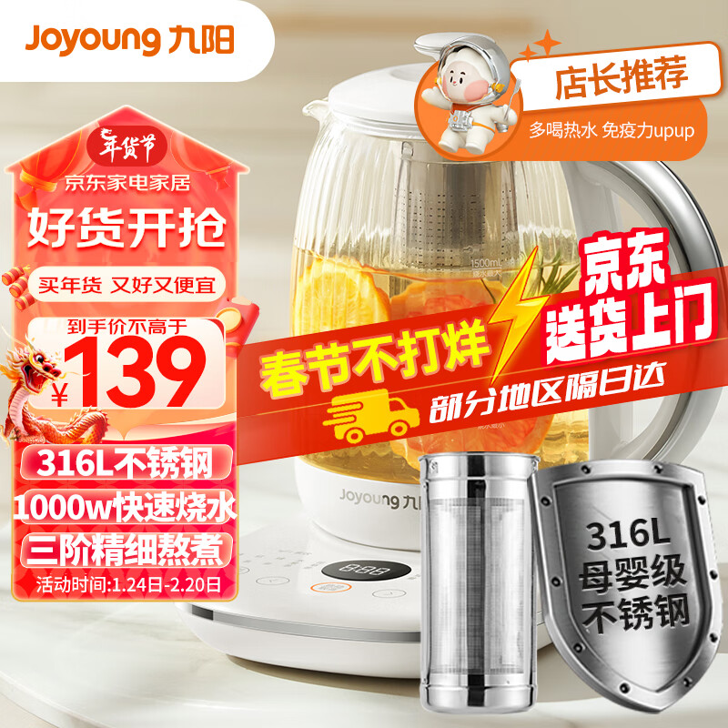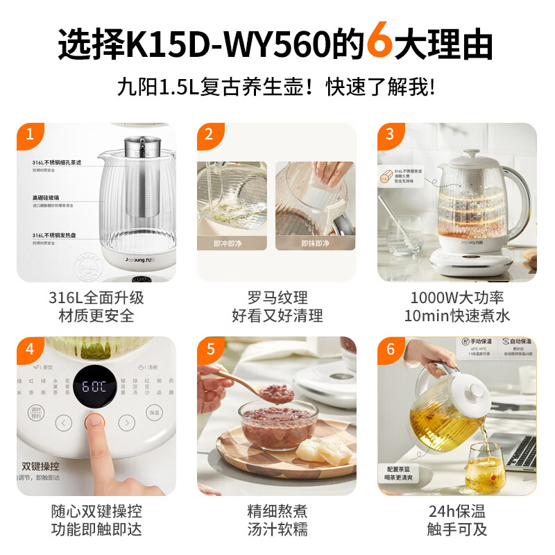 九阳(Joyoung)养生壶轻复古玻璃花茶壶 10大功能11档调温316L材质 电水壶热水壶恒温水壶1.5L K15D-WY560价格:139.00元!