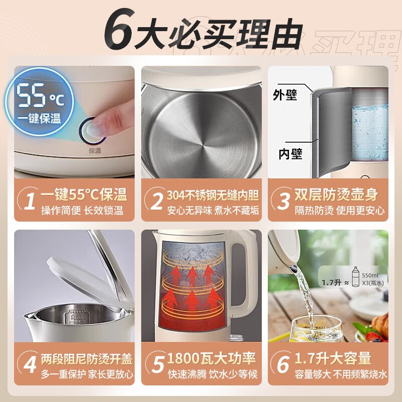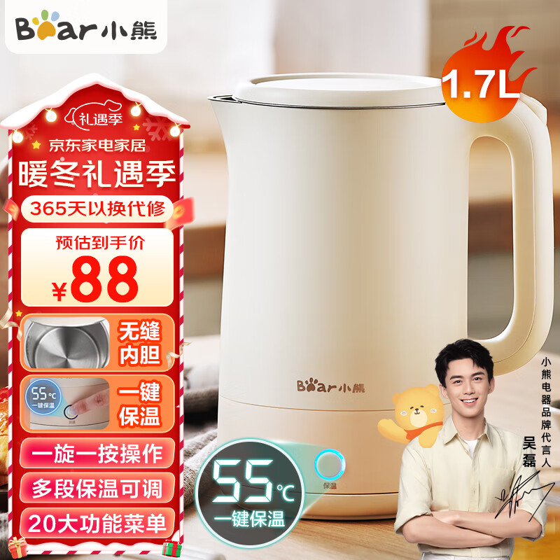 小熊(Bear)电水壶 电热水壶 家用大容量热水壶烧水壶 恒温水壶一体保温壶 一键保温304不锈钢双层防烫开水壶 ZDH-Q17H5【1.7升 奶油白 家用办公】价格:88.00元!