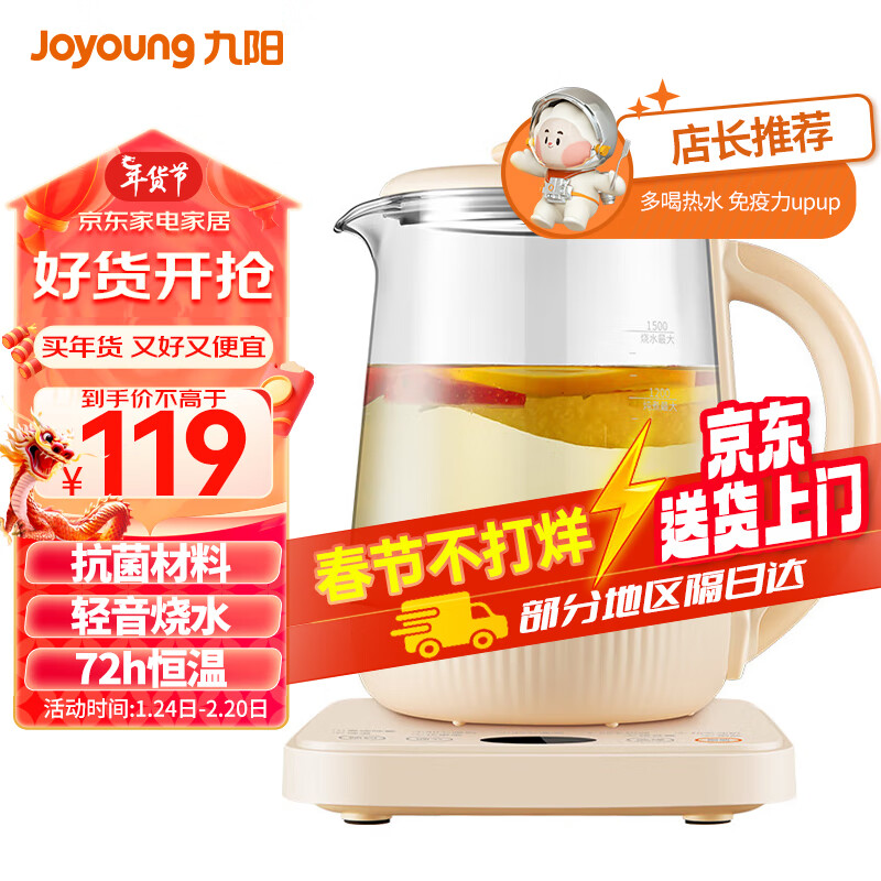 九阳(Joyoung)养生壶玻璃花茶壶煮茶器 72h智能恒温 316L不锈钢 电水壶热水壶烧水壶1.5L K15D-WY190价格:119.00元!