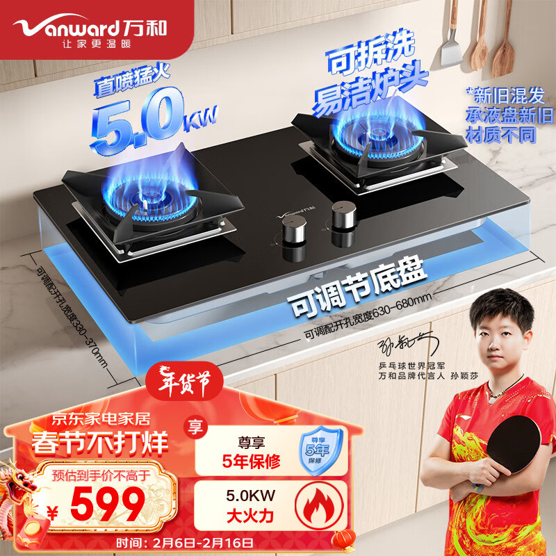 万和(Vanward)燃气灶天然气 双灶具 家用5.0kW猛火灶台嵌两用 钢玻面板 可调节底盘 65%热效率JZT-C5L90S 天然气价格:599.00元!