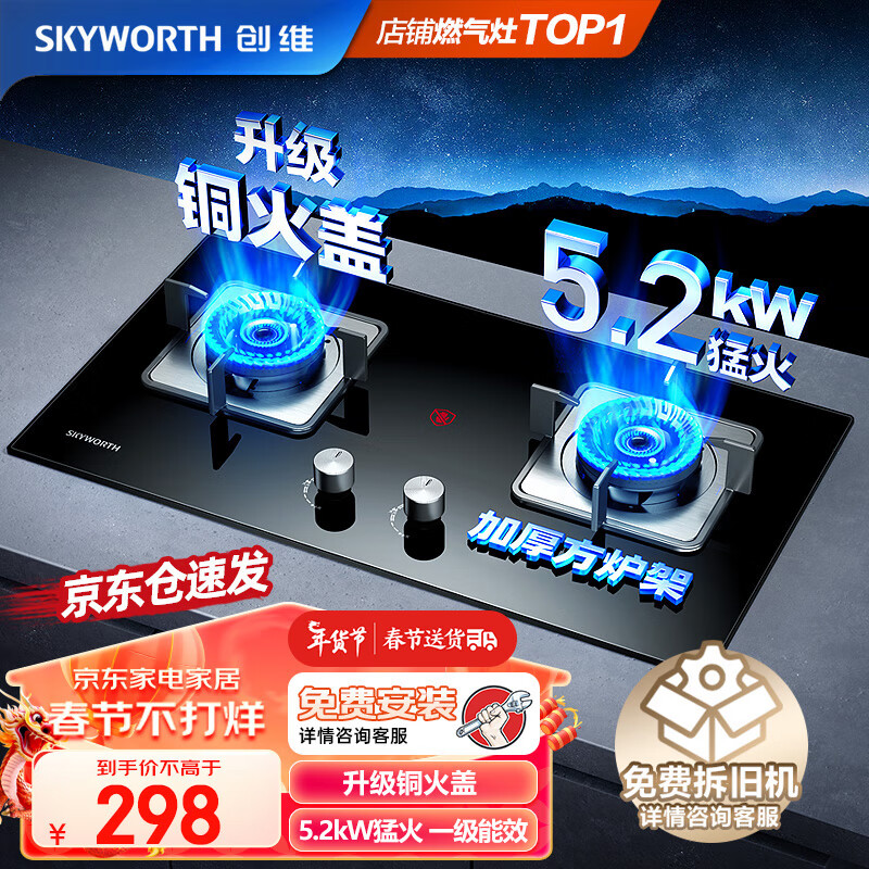 创维(Skyworth)燃气灶双灶家用 天然气猛火灶 5.2kW大火力灶具 台式嵌入式 钢化玻璃灶台免改孔Z50BS-1/天价格:288.00元!