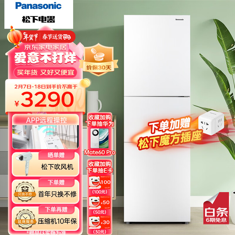 松下(Panasonic)三门冰箱303升智能app宽幅变温冰箱银离子除菌净味-3度微冻保鲜优选NR-EC30AP1-W以旧换新价格:3290.00元!