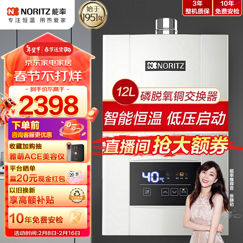 能率(NORITZ)燃气热水器 12升 CPU智能控制系统 智能精控恒温 GQ-12E3FEX(天然气)(JSQ24-E3)价格:2398.00元!