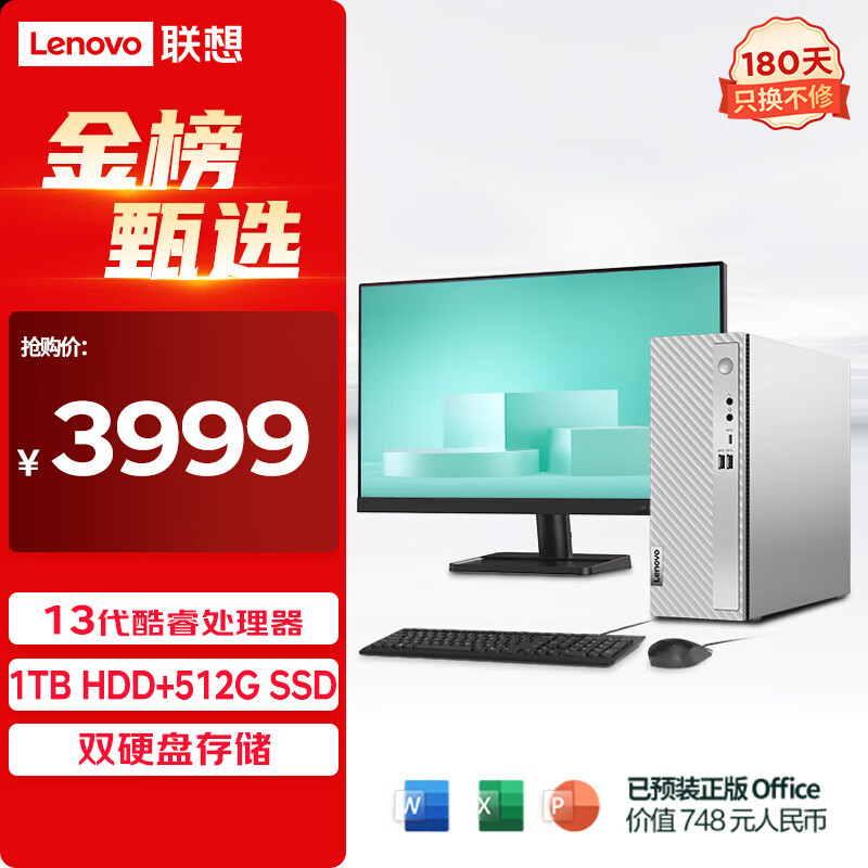 联想(Lenovo)天逸510S商务办公台式机电脑主机(酷睿13代i5-13400 16G 1TB HDD+512G SSD win11)23英寸显示器价格:3999.00元!