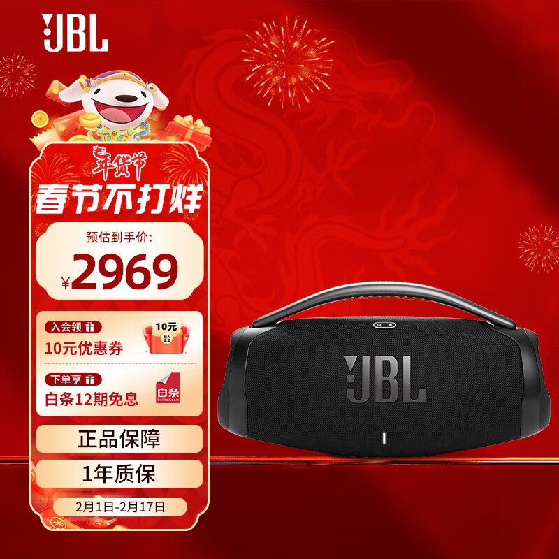 JBL BOOMBOX3 音乐战神三代3代 便携式蓝牙音箱 低音炮 户外音箱 IP67防尘防水 多台串联 长续航 黑色价格:2969.00元!