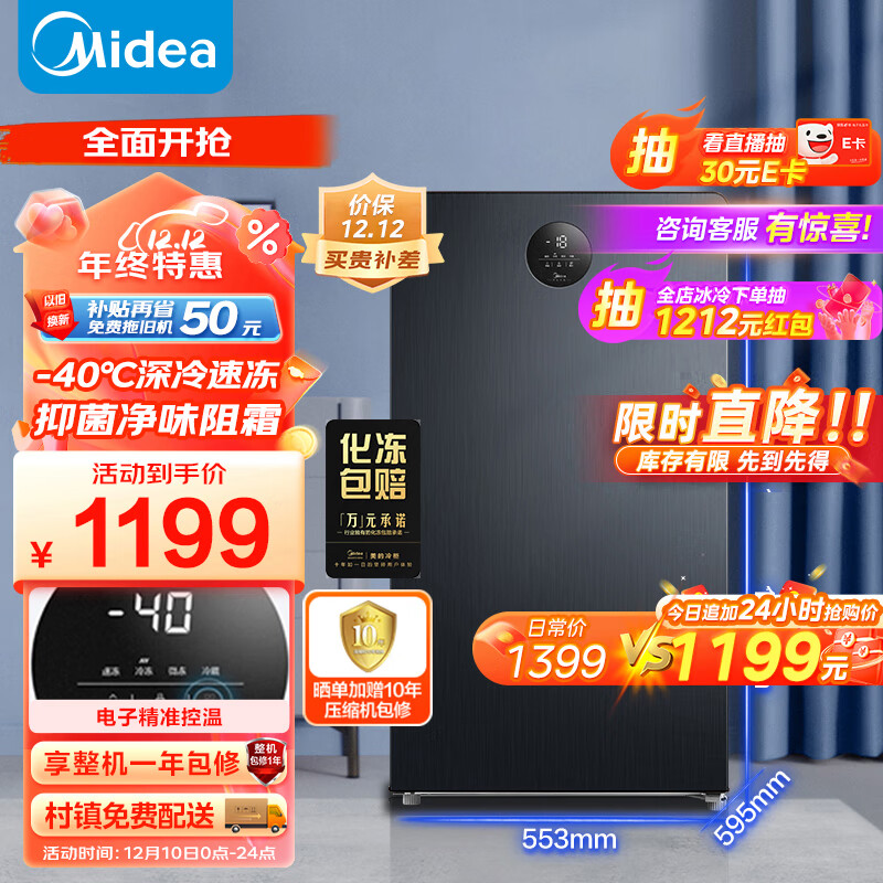 美的(Midea)120升 减霜节能家用立式冰柜 电子控温冷藏冷冻转换 抽屉式小型全冷冻冰箱冷柜 BD/BC-120UEM价格:1299.00元!
