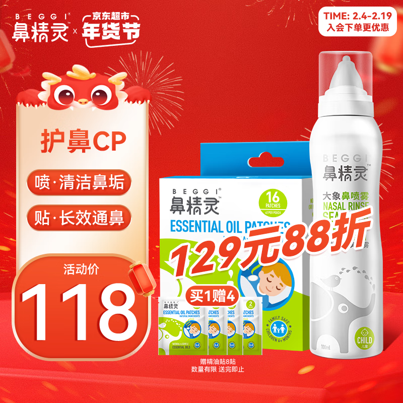 BEGGI鼻精灵通气鼻贴16贴海盐水喷雾奶嘴鼻喷100ml儿童款组合套装价格:138.00元!