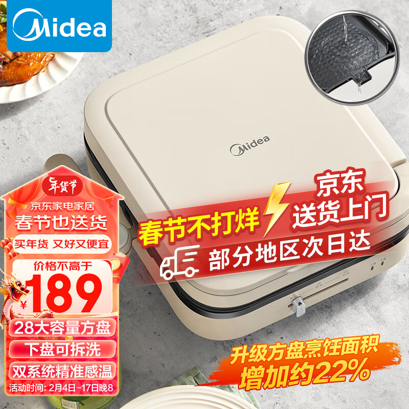 美的(Midea)电饼铛家用下盘可拆洗大火力三明治早餐机煎烤锅 方形双面加热加深大尺寸升级蒸汽烙饼烤肉锅28J51价格:219.00元!