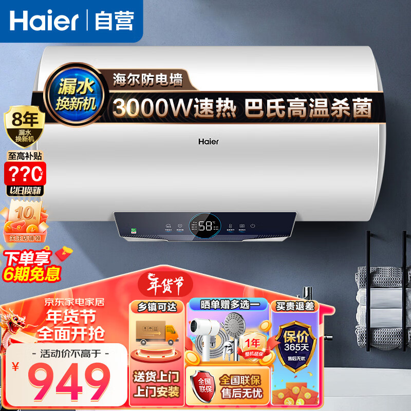 海尔(Haier)60升海尔热水器电热水器3000W速热家用储水式WIFI智慧物联健康净水洗浴防电墙PA1价格:949.00元!