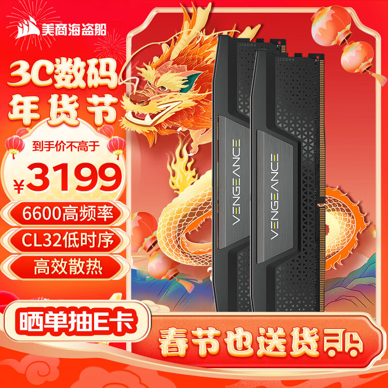 美商海盗船 (USCORSAIR) 96GB(48Gx2)套装 DDR5 6600 台式机内存条 复仇者系列 游戏条 黑色 C32价格:3199.00元!