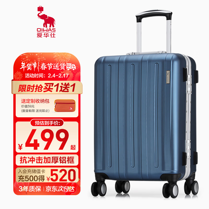 爱华仕行李箱铝框拉杆箱男万向轮登机箱20英寸女旅行箱商务密码箱 蓝色价格:649.00元!