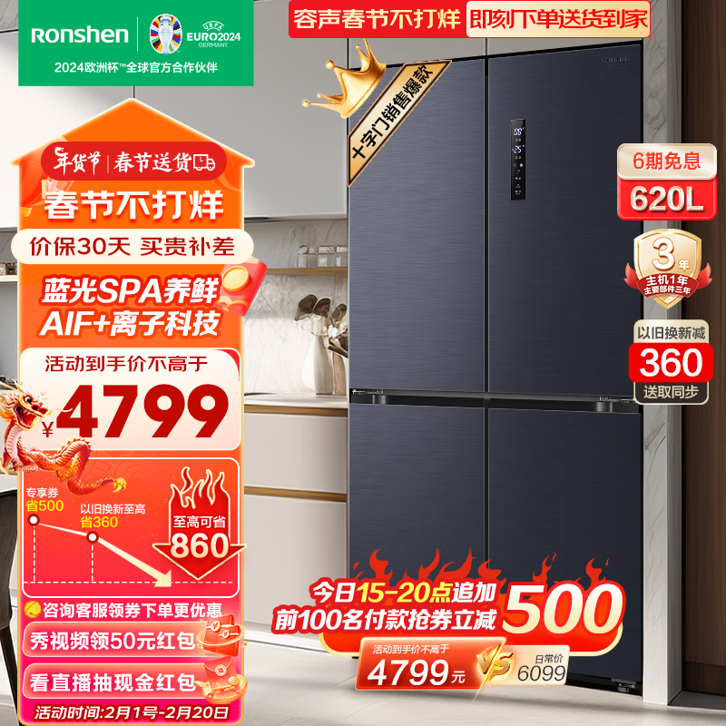 容声(Ronshen)620L十字对开四门大容量一级超薄变频风冷无霜冰箱BCD-620WD19FP 灰色 青山黛价格:5799.00元!