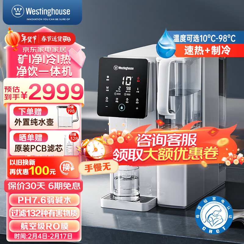 西屋(Westinghouse)台式免安装净饮一体机家用 加热制冷直饮机 桌面即热式饮水机 F5曼哈顿版(矿化弱碱&制冷速热)价格:2999.00元!