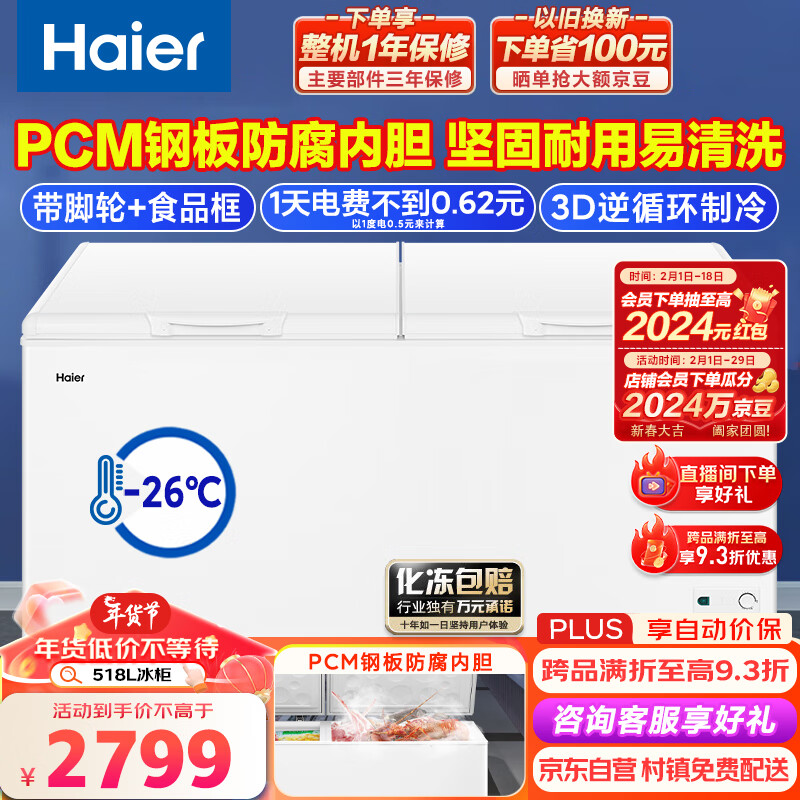 海尔(Haier)518升卧式商用家用冰柜 商用大容量 冷藏柜大冷冻柜冰柜家用冰箱大冷柜BC/BD-518GHPD以旧换新价格:2949.00元!