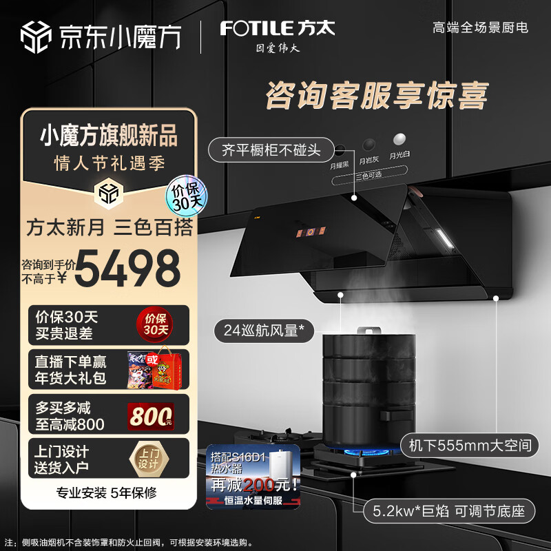 方太(FOTILE)抽吸油烟机灶具套装 侧吸式变频烟灶24巡航风量智能挥手5.2kW火力燃气双灶 F1A+02-TH27B天然气价格:5498.00元!