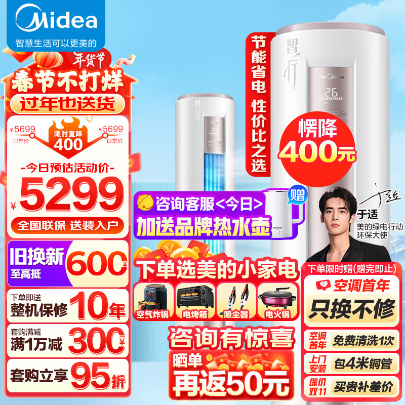 美的 空调智行3匹新能效变频冷暖一键智控温智能客厅立式空调柜机 KFR-72LW/BDN8Y-YA400(3)A 以旧换新价格:5299.00元!