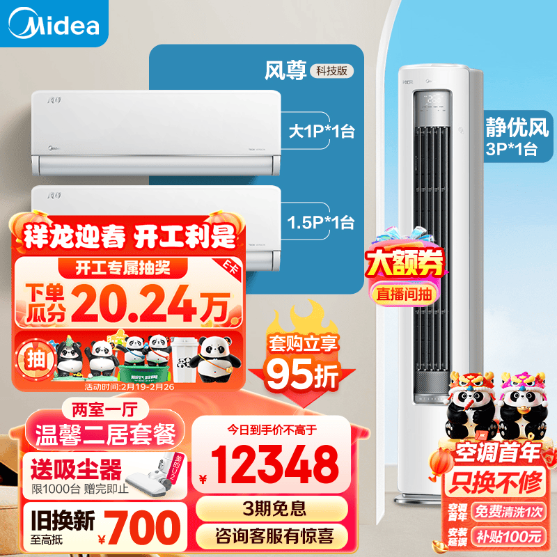 美的(Midea)空调 风尊静优风系列 温馨二居套餐 两室一厅(大1匹风尊科技版+1.5匹风尊科技版+3匹静优风柜机)价格:12997.00元!