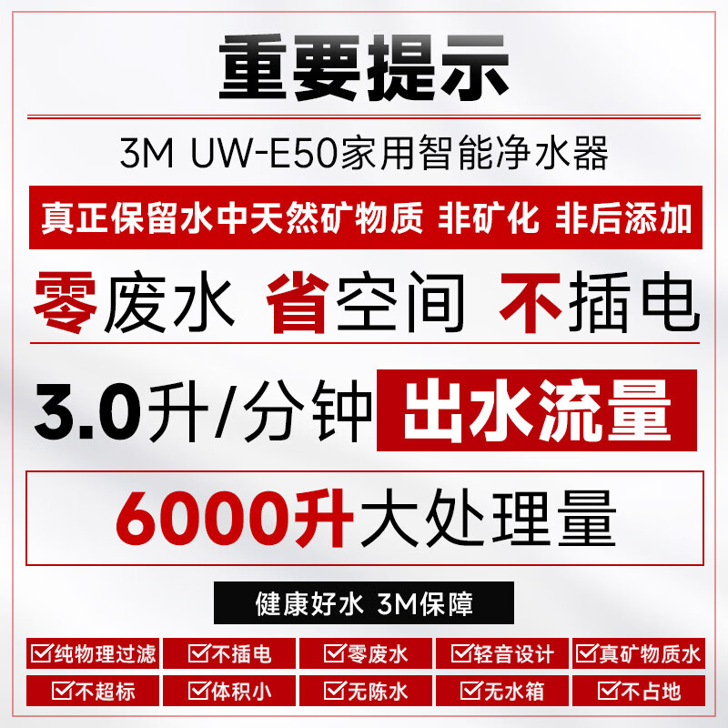 3M净水器家用净水机0废水矿物质智能直饮3L/分大流量6000升处理量1200G过滤器UW-E50价格:5699.00元!