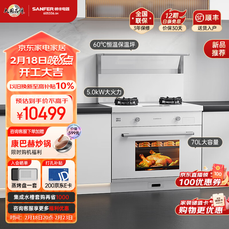 帅丰(SANFER)TJ2-7B-90集成灶蒸烤一体集成灶 蒸箱 烤箱 蒸烤箱 集成一体吸油烟机燃气灶 白色价格:10499.00元!