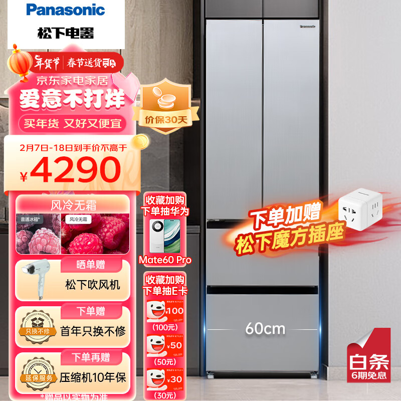 松下(Panasonic)400升四门法式超薄冰箱 银离子 60cm宽占地小 风冷无霜优选NR-ED40WPA-S冰河银【23年上新】价格:4290.00元!