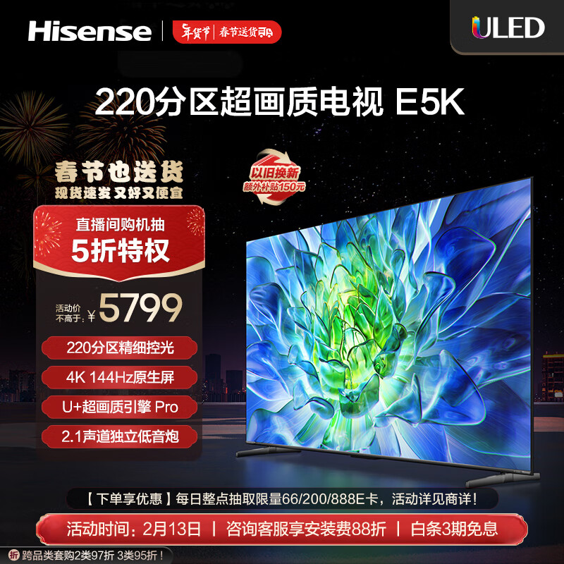 海信电视75E5K 75英寸 ULED 220分区 4+64GB 4K 144Hz超高清智慧屏 智能液晶平板电视机 以旧换新价格:5779.00元!