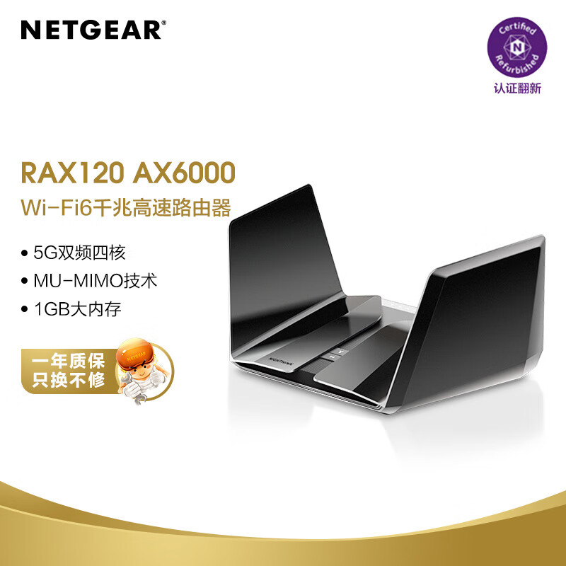 网件(NETGEAR)RAX120 AX6000 wifi6无线路由器千兆电竞/2.5G端口/5G双频四核/MESH可扩展/认证翻新价格:1599.00元!