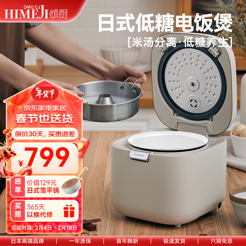 倾厨 日本低糖电饭煲电饭锅米汤分离智能降低淀粉 小型家用多功能2-3人迷你电饭煲可定时 原木杏白【濑户烧陶瓷釉内胆】价格:999.00元!