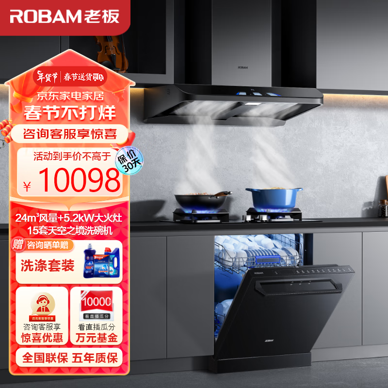 老板(Robam)钢琴家D3S智能变频 24风量抽油烟机15套洗碗机嵌入式独立式两用厨房多件套62D3S+57B6DT+F80D黑价格:10098.00元!