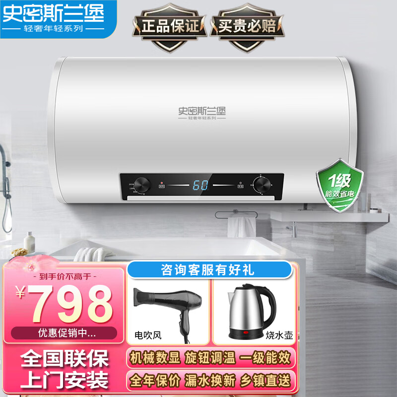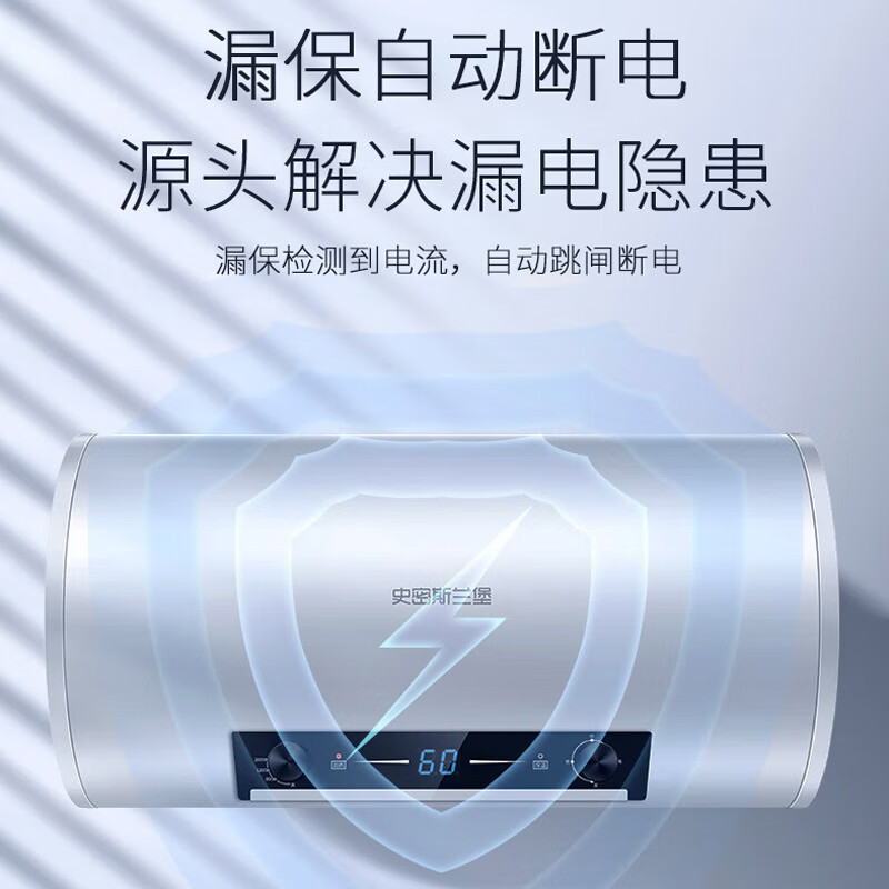 史密斯兰堡电热水器储水式 家用80升L家用恒温2200W双重防护卫生间出租房速热洗澡淋浴机一级能效DSZF-T02Y80价格:758.00元!