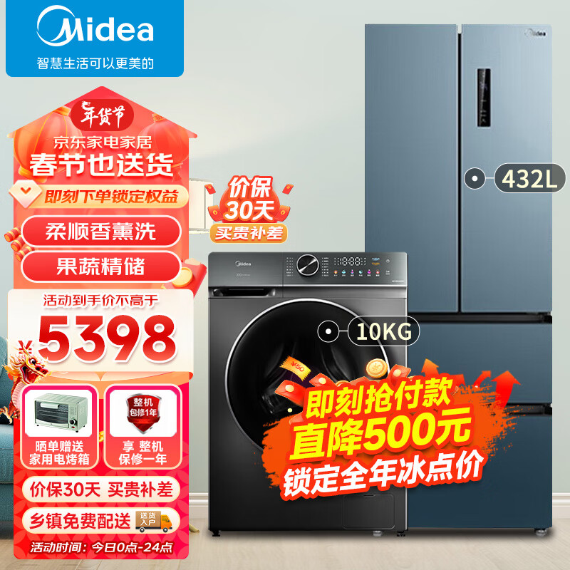 美的(Midea)冰洗套装 432升法式冰箱+10公斤DD直驱变频滚筒 洗烘一体BCD-432WFPZM(E)+MD100V650DE价格:5398.00元!
