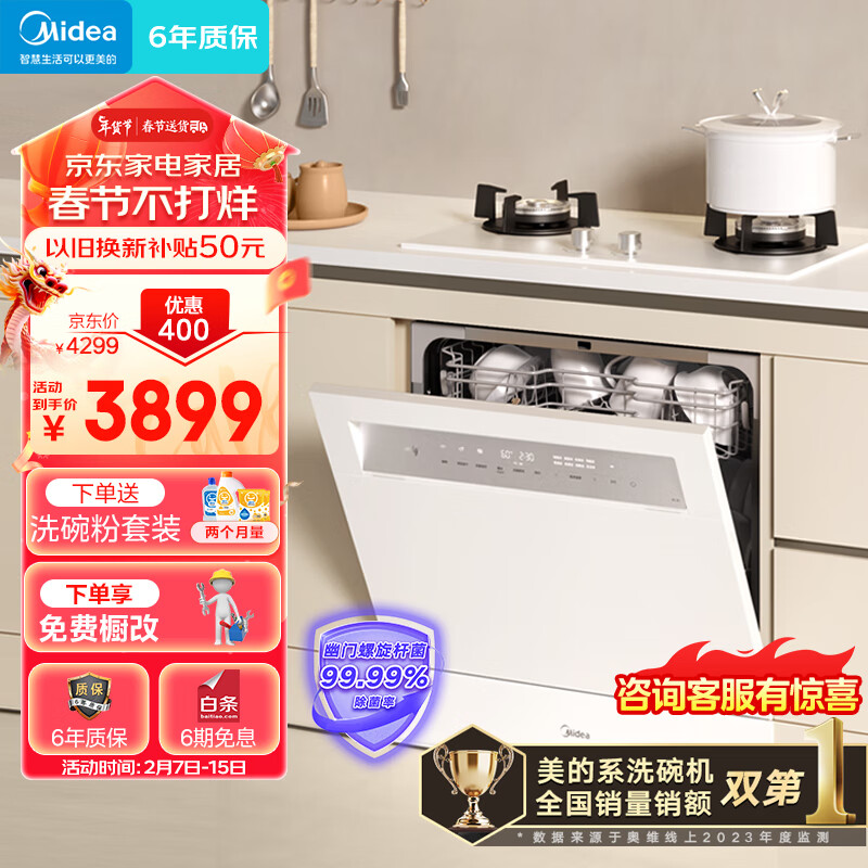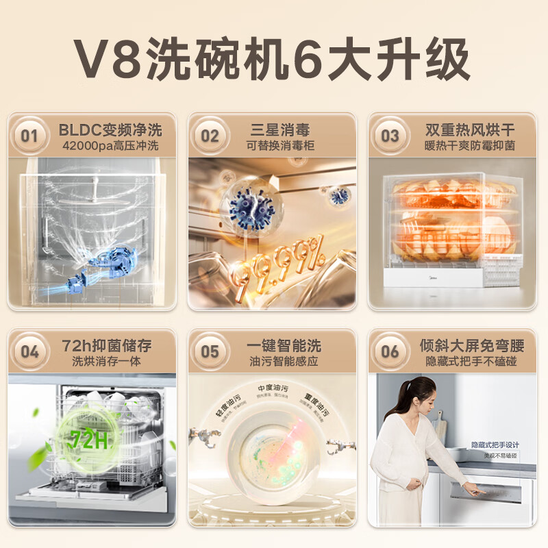 美的(Midea)洗碗机嵌入式台式 10套 家用灶下安装 变频节能 热风烘干 洗碗机一体机 V8(白)价格:5999.00元!