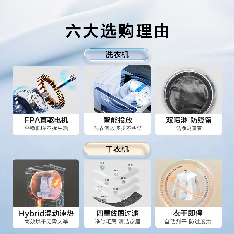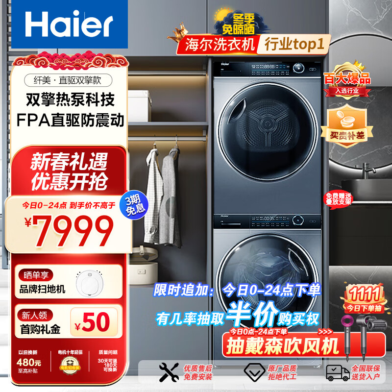 海尔(Haier)纤美双擎热泵10Kg洗烘套装 全自动洗衣机烘干机 超薄直驱变频 智能投放正反转176洗烘套以旧换新价格:7999.00元!