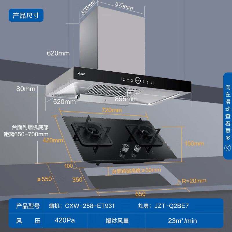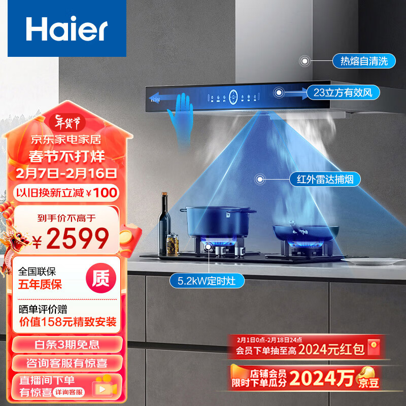 海尔(Haier)抽油烟机 顶吸欧式烟灶套装 23m3/min有效风 挥手智控 5.2KW定时灶 烟机灶具套装ET931+Q2BE7(天)价格:2599.00元!