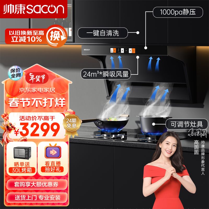 帅康(Sacon)油烟机 顶侧双吸静音吸挥手 24大风量7字机 变频油烟机搭可调节灶套餐 Y8275+LB850B2(天然气)价格:3299.00元!