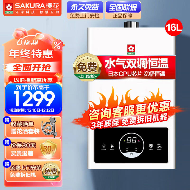 樱花(SAKURA)燃气热水器天然气16升 水气双调 日本CPU 智能精控恒温 低压启动 多重安防 家用 JSQ30-JJP002价格:1499.00元!