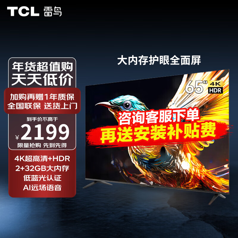 TCL 雷鸟 雀5 65英寸 4K超高清 智能电视 2+32GB 护眼防蓝光屏 游戏电视 液晶平板电视机 65F275C价格:2199.00元!