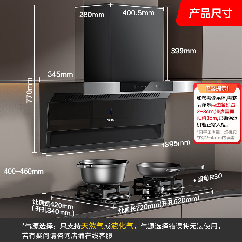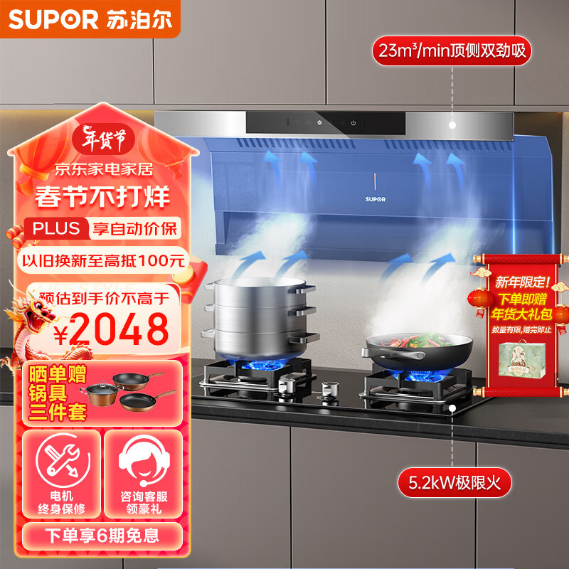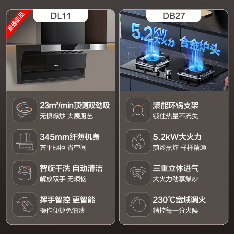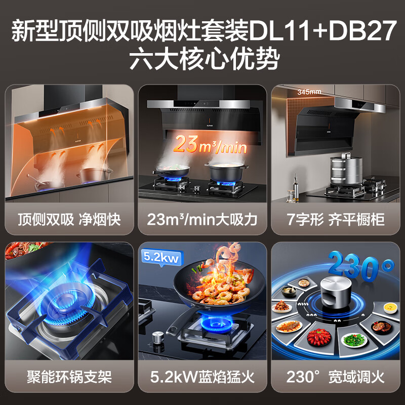 苏泊尔(SUPOR)抽油烟机 顶侧双吸7字型烟灶套装23立方挥手免拆洗家用烟机燃气灶具套装DL11+DB27液价格:2048.00元!