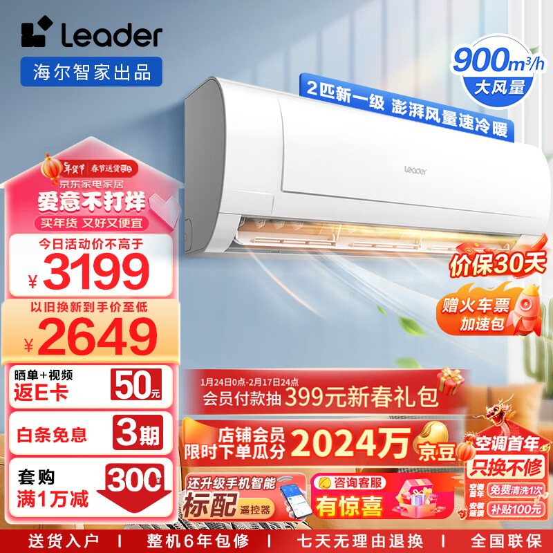 Leader空调 海尔智家出品 2匹新一级客厅变频空调挂式 自清洁空调挂机 KFR-50GW/18MDA81TU1价格:3199.00元!