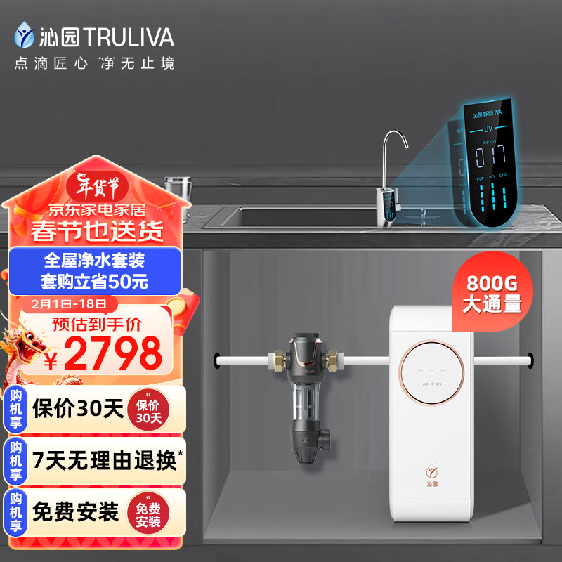 沁园(TRULIVA)小白鲸Pro800G二件套装 净水器UR-S5876i+前置过滤器P-A5510 全屋净水套装价格:2798.00元!