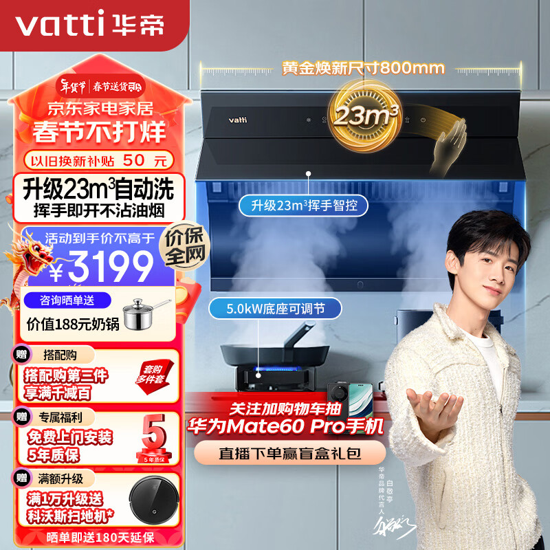 华帝(VATTI)抽油烟机家用大吸力小尺寸烟机燃气灶烟灶套装23风量自动清洗侧吸吸油烟机灶具套装i11170液化气价格:3199.00元!