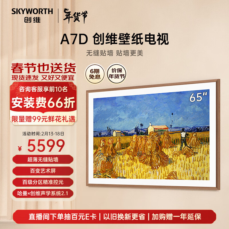 创维壁纸电视65A7D 65英寸 龙年定制超薄壁画艺术电视机 无缝贴墙百变艺术屏 4K超高清护眼液晶电视价格:5599.00元!