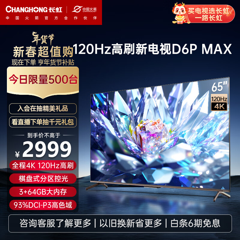 长虹电视65D6P MAX 65英寸游戏电视 4K120Hz 3+64GB大内存 分区背光 LED平板液晶电视机 以旧换新价格:2999.00元!