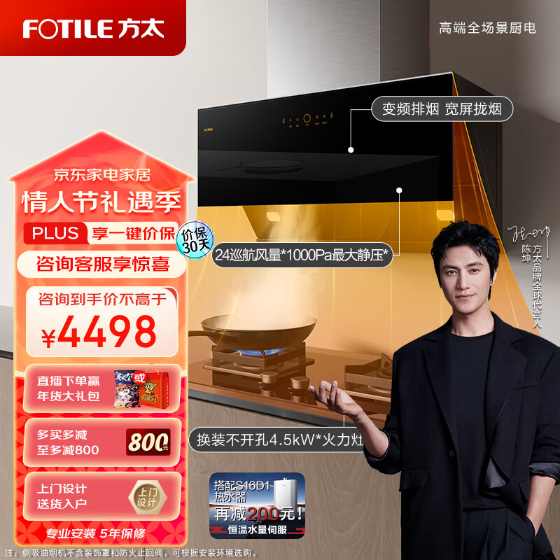 方太(FOTILE)抽吸油烟机灶具套装侧吸变频烟灶24大风量智能巡航挥手智控换装4.5kW双灶JCD16T+02-HT8BE.S天然气价格:4498.00元!