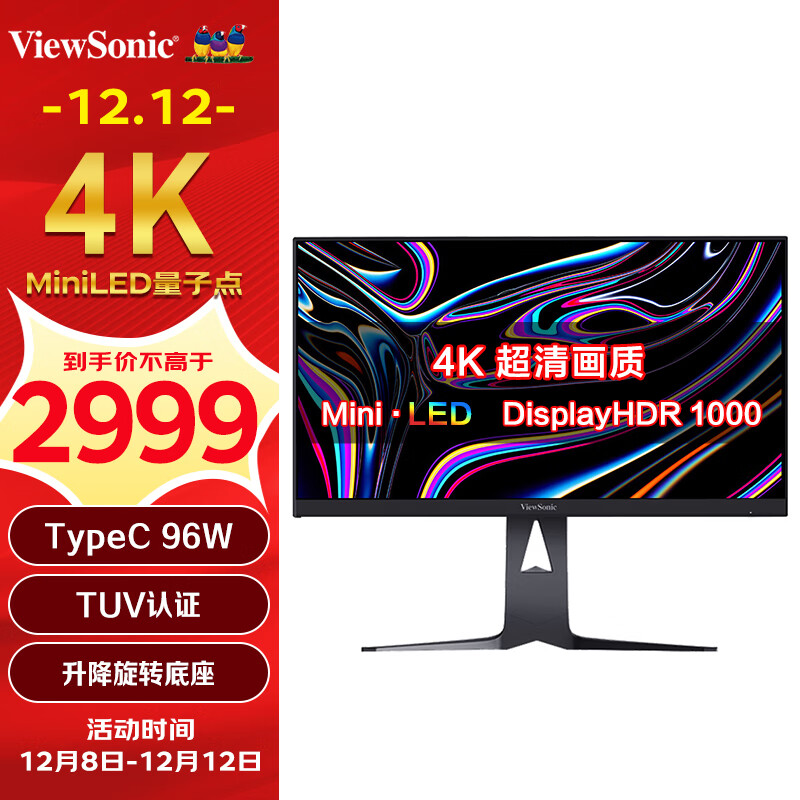 优派27英寸4K MiniLED量子点 广色域IPS TypeC96W HDR1000 TUV爱眼不闪屏旋转升降电脑显示器VX2781价格:2999.00元!