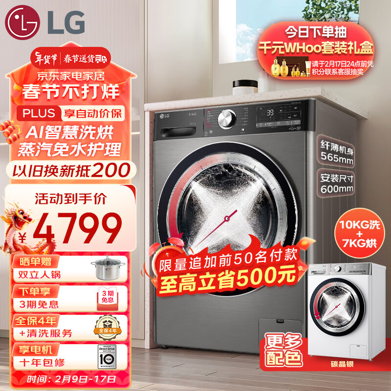LG小旋风系列 10KG超薄洗烘一体机家用 直驱变频 旋风速净洗 蒸汽除菌 360°速净喷淋 银 FCW10D4PA价格:5299.00元!